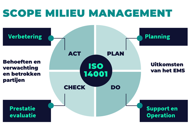 ISO 14001 biedt een kader om te voldoen aan de eisen van internationale normen voor milieumanagementsystemen (MMS) en vereist dat organisaties hun milieueffecten beheren door zich in te zetten voor preventie van verontreiniging, naleving van de wetgeving en continue verbetering.